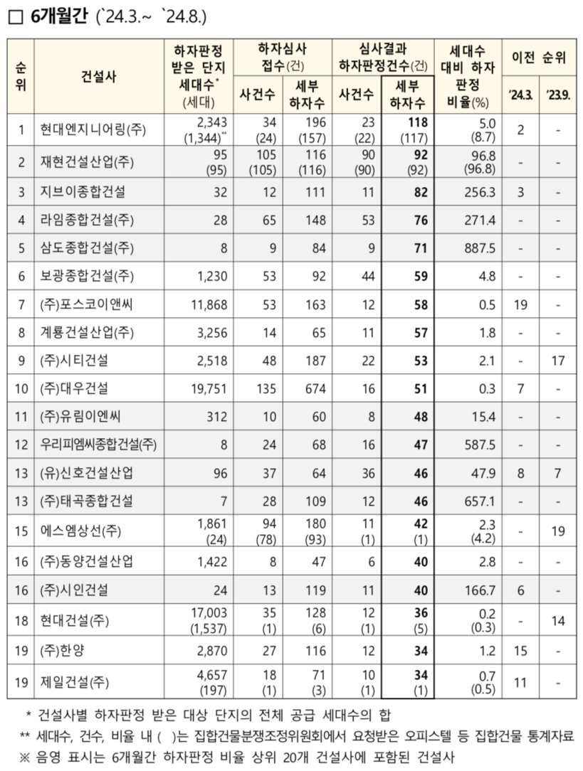 최근 6개월(2024년 3월~8월) 기준으로 하자판정 건수의 경우 상위 건설사는 현대엔지니어링㈜(118건), 재현건설산업㈜(92건), 지브이종합건설(80건), 라임종합건설㈜(76건), 삼도종합건설㈜(71건), 보광종합건설㈜(59건) 등의 순으로 나타났다.