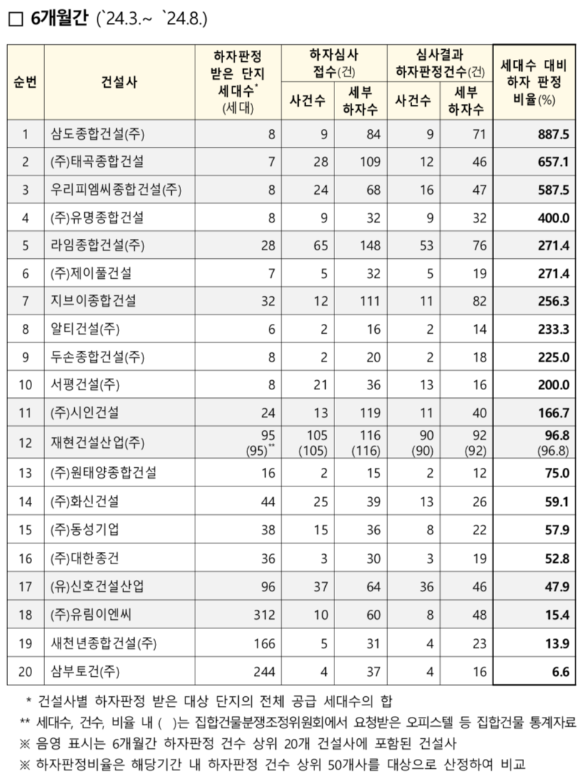 이 기간 하자판정 비율이 높은 상위 건설사는 ㈜삼도종합건설(888%), ㈜태곡종합건설(657%), 우리피엠씨종합건설㈜(588%), ㈜유명종합건설(400%) 및 라임종합건설㈜(271.4%) 순으로 나타났는데 공급 세대수가 50호 미만인 소규모건설사가 주를 이루었다.