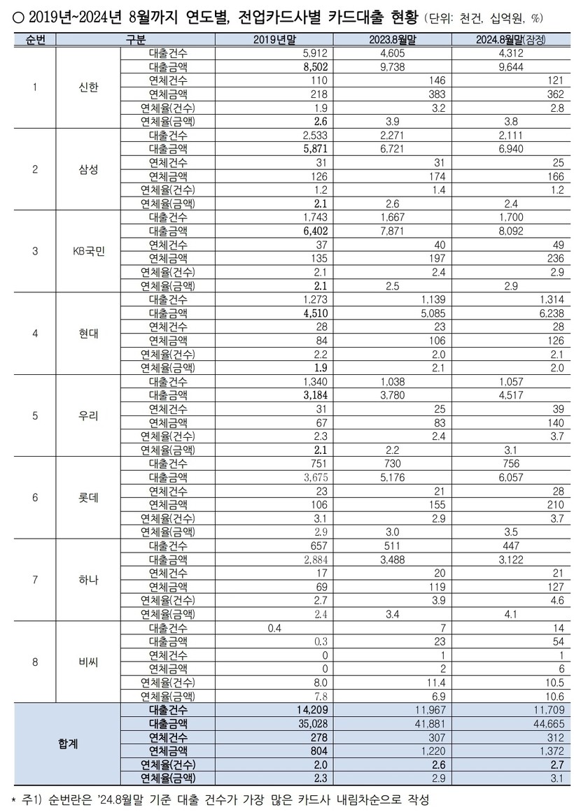 국회 정무위원회 소속 국민의힘 강민국 의원실에서 금융감독원에 자료요구를 통해 받은 답변자료인 '국내 카드 대출 및 연체 현황'을 살펴보면 2024년 8월 말 현재 카드 대출금액은 총 44조 6650억 원(1170만 9000건) 이나 됐다. 이는 금융감독원이 통계를 추산한 지난 2003년 이후 가장 많은 대출 규모이다.