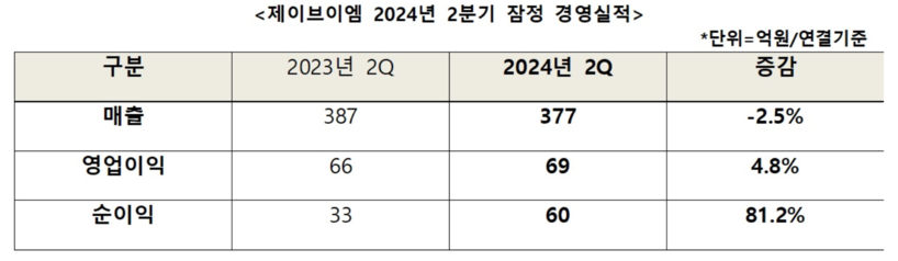 제이브이엠은 올해 2분기 연결기준으로 매출 377억 원과 영업이익 69억 원, 순이익 60억 원을 달성했다고 25일 잠정 공시했다.