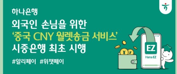[일요주간 = 김완재 기자] 하나은행(은행장 이호성)이 국내 시중은행 최초로 중국의 알리페이와 위챗페이를 통한 위안화(CNY) 해외송금 서비스를 시작하며 외국인 고객 대상 디지털 금융 서비스를 확대하고 있다.