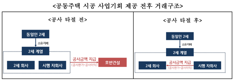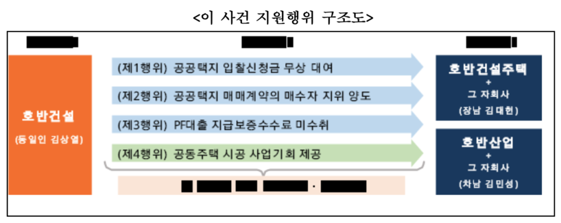호번건설은 이 과정에서 창업주 김상열 전 회장의 장남 김대헌 소유의 호반건설주택과 차남 김민성 소유의 호반산업을 부당하게 지원해 1조 원이 넘은 이익을 가져가게 하는 등 부당거래를 일삼은 것으로 드러났다.