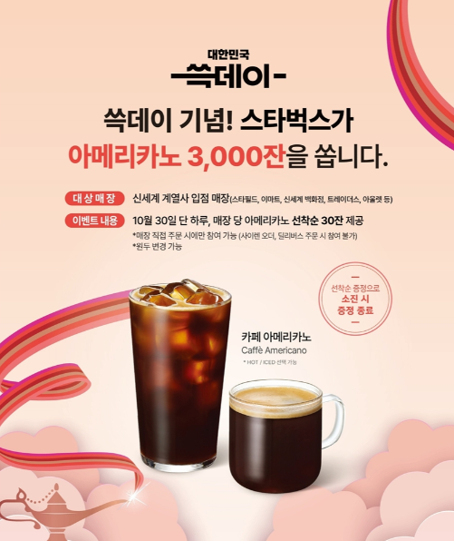 스타벅스는 쓱데이 행사가 시작하는 30일 하루 동안 이마트, 스타필드, 신세계백화점, 신세계사이먼 아울렛 등에 입점해 있는 스타벅스 매장 100여 곳에서 매장별 선착순 30명씩 총 3천 잔의 아메리카노를 증정한다.