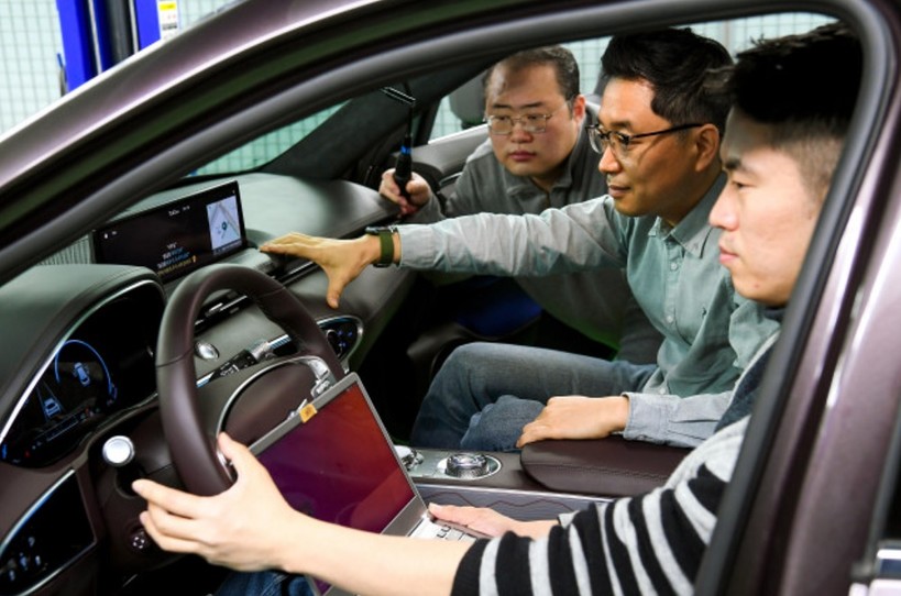 ▲ 현대자동차그룹 연구원들이 ‘커넥티드 카 인공지능 음성인식 기술’을 자동차에서 테스트하고 있다. (사진=현대자동차그룹) |