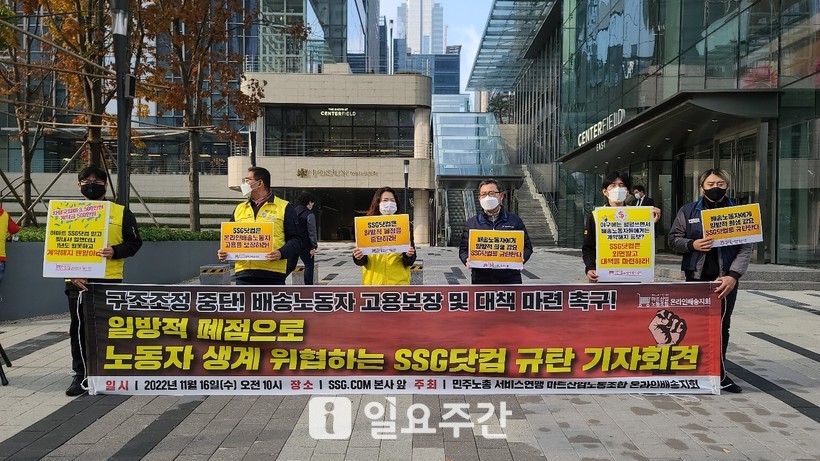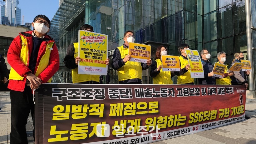 ▲마트산업노동조합 온라인배송지회는 16일 오전 10시 SSG닷컴 본사 앞에서 일방적 폐점과 구조조정을 진행하면서 온라인배송노동자들에게 계약해지를 통보한 SSG닷컴을 규탄하고 대책을 요구하는 기자회견을 열었다.(사진=이수근 기자) |