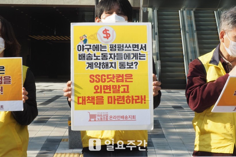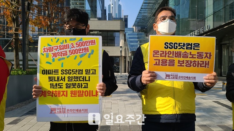 [일요주간 = 이수근 기자] “배송노동자들이 앉아서 수천만 원의 손해를 보게 됐다. 이 중에는 일한지 1년도 되지 않은 노동자도 있다. 지난달 계약해지 통보를 받은 한 배송노동자는 올 3월 SSG닷컴(쓱닷컴)에 일하러 들어오면서 4000만 원(차량구입비 3500만 원, 계약금 500만 원)을 써야했고 1년도 채 되지 않아 갑자기 일할 점포가 없어져 이제는 1000만 원도 건지지 못할 처지에 처해있다. 이들은 이마트와 SSG닷컴라는 대기업을 믿고 일을 시작한 노동자들로, 최소한 고용보장 등 대책을 마련해야 한다. 온라인배송노동자들은 일회용품이 아니다.”