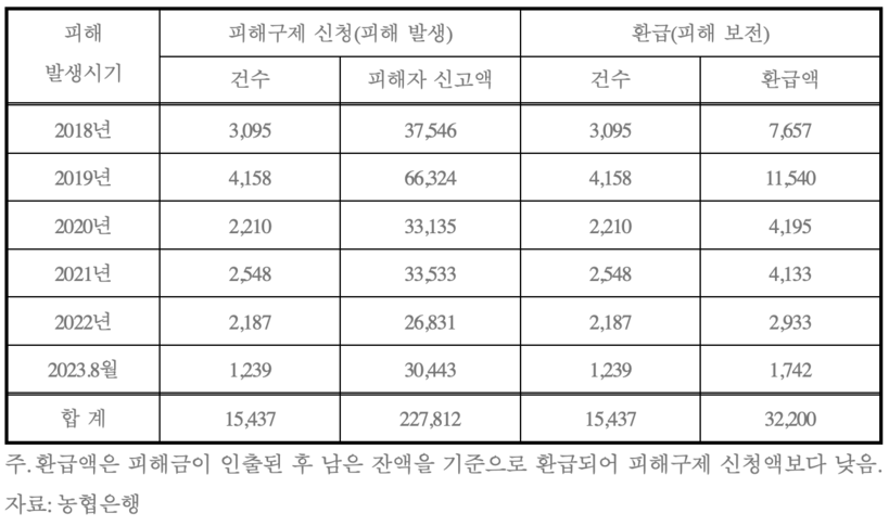 지난 10월 국회 농림축산식품해양수산위원회 국정감사에서 국민의힘 정희용 의원이 농협은행으로부터 제출받은 '최근 5년여(2018~2023. 8월) 간 보이스피싱 피해 및 환급 현황' 자료를 분석한 결과 농협은행을 통한 보이스피싱 피해자의 피해 신고액은 2018년 375억 4600만 원, 2019년 663억 2400만 원, 2020년 331억 3500만 원, 2021년 335억 3300만 원, 2022년 268억 3100만 원, 2023년 8월 기준 304억 4300만 원으로 5년여 간 총 2278억 1200만 원에 달했으며 신고 건수도 1만 5437건으로 확인됐다.