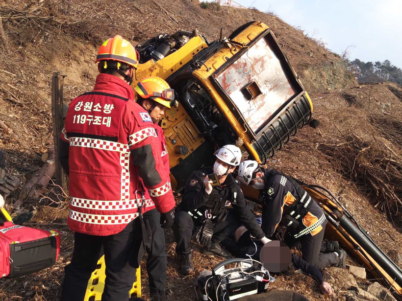 | ▲지난해 12월 26일 강원 횡성 갑천면 한 야산에서 포크레인이 전복돼 119 구조대원들이 구조 작업을 벌이고 있다.(사진=강원도소방본부 제공) |