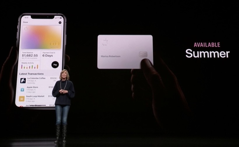 | ▲ 애플이 자체 행사에서 발표한 애플카드 앱 화면과 실물 모습 (이미지=애플) |