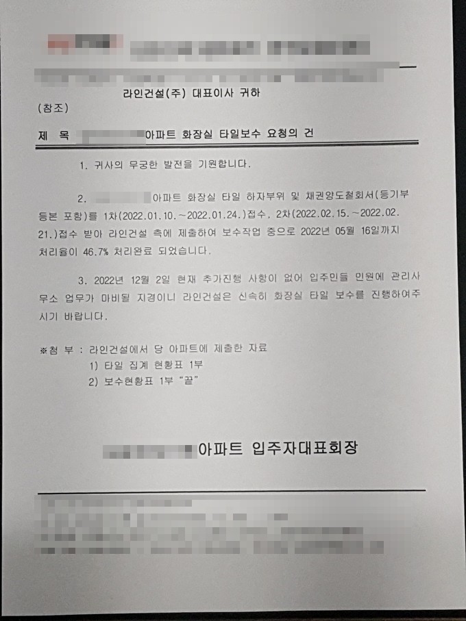 입주자대표회의 측은 “화장실 타일 하자부위 및 채권양도철회서를 받아 라인건설에 제출해 보수작업 중으로 2022년 5월 16일까지 (하자) 처리율이 46.7% 처리완료 됐다”며 “12월 2일 현재 (하자 보수와 관련) 추가진행 사항이 없어 입주민들 민원에 관리사무소 업무가 마비될 지경이니 라인건설은 신속한 화장실 타일 보수를 진행해 주기를 바란다”고 제촉했다.
