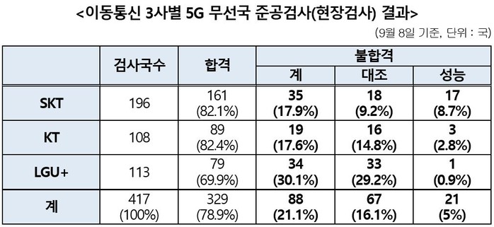 무선국 준공검사는 기술 기준의 충족 여부를 확인하는 '성능검사'와 제반사항 이행을 확인하는 '대조검사'로 분류된다. 이 중 성능검사에서 불합격률이 가장 높은 통신사는 SK텔레콤으로 전체 검사 무선국 196개 중 8.7%인 17개 무선국이 성능검사에서 불합격했다. 이어 KT는 108개 무선국 중 3개 무선국(2.8%)이 성능검사에서 불합격했고 LG유플러스는 113개 무선국 중 성능검사 불합격 무선국은 1개(0.9%)에 그쳤다.