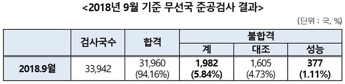 전체 검사 대상 무선국 113개 중 29.2%인 33개 무선국이 불합격했다. KT는 108개 무선국 중 대조검사에서 불합격한 무선국이 16개(14.8%)로 확인됐고 SK텔레콤은 196개 무선국 중 18개(9.2%) 무선국이 대조검사에서 불합격했다.