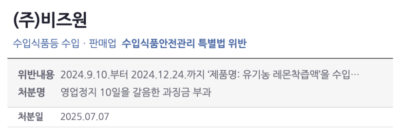 위반 사실은 지난 4월 10일 현장 점검 과정에서 적발됐으며, 제품명은 공식적으로는 ‘해당 없음’으로 표시됐지만 수입신고 내역상 '유기농 레몬착즙액'으로 확인됐다. 문제의 제품은 수입·유통되었으나, 유통기한 및 소비기한은 명시되지 않은 것으로 알려졌다.