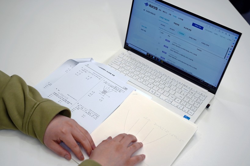 ▲ 시각장애 학생이 세상파일과 교육지대가 지원한 점자 모의고사 자료를 학습하고 있다.(사진=SK행복나눔재단 제공) |