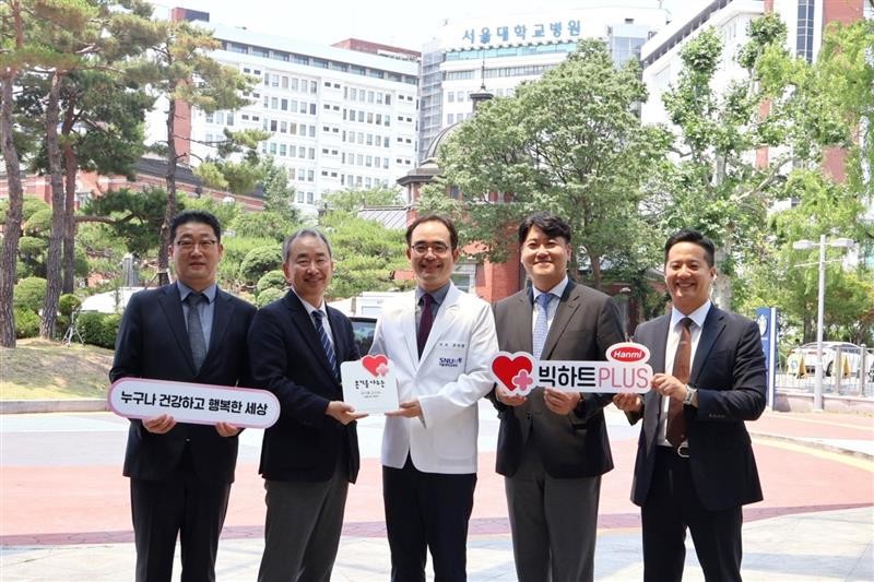 ▲ 요양병원 간암 환자의 사연을 소개한 서울대병원 소화기내과 유수종 교수(가운데)와 한미그룹 임직원들이 ‘빅하트PLUS’ 현판 전달식 후 기념촬영을 하고 있다. (사진=한미약품 제공)