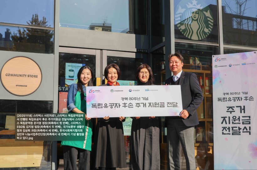 스타벅스는 지난 8월 광복 80주년을 맞아 기존에 지속해오던 커뮤니티 스토어의 기금 조성 활동과 더불어 커뮤니티 스토어 6호점(독립문역점)과 9호점(환구단점)의 8월 수익금 전액을 별도로 적립해 경제적으로 어렵게 생활하고 있는 독립유공자 후손들에게 기부하기로 약속한 바 있다.