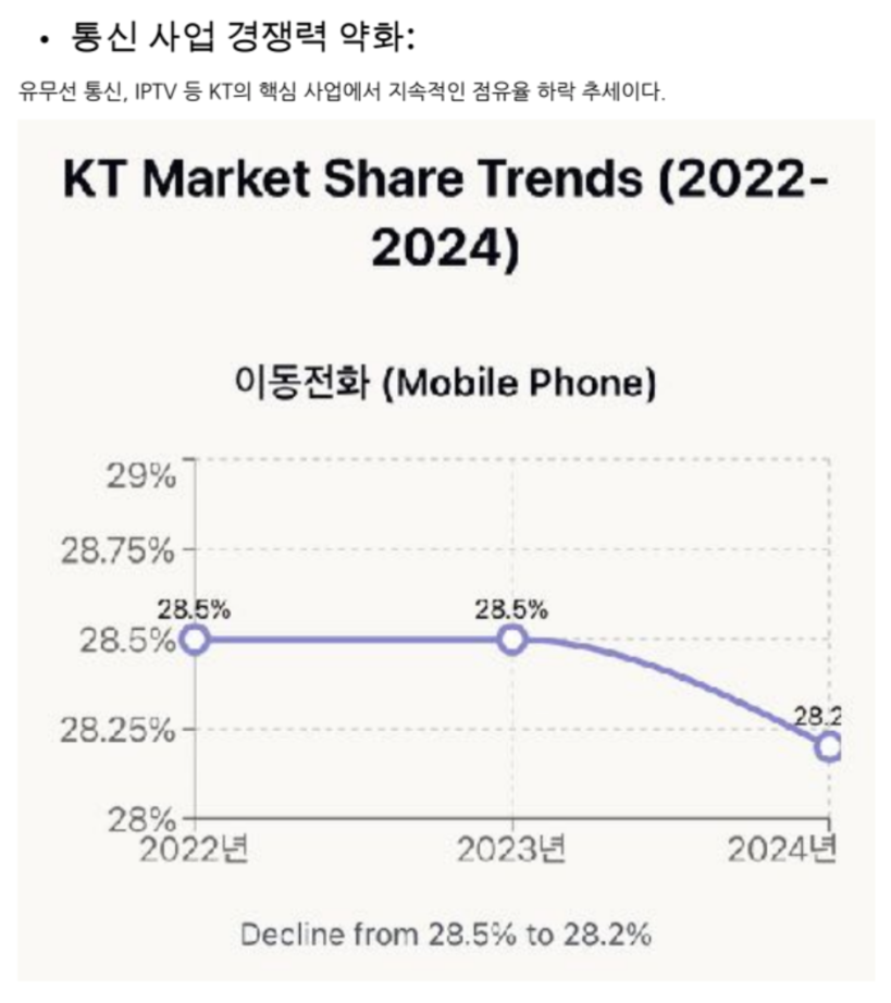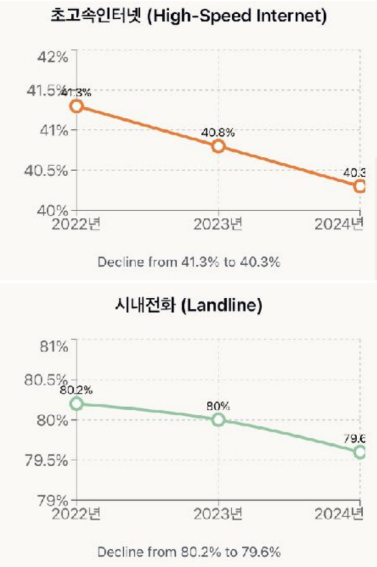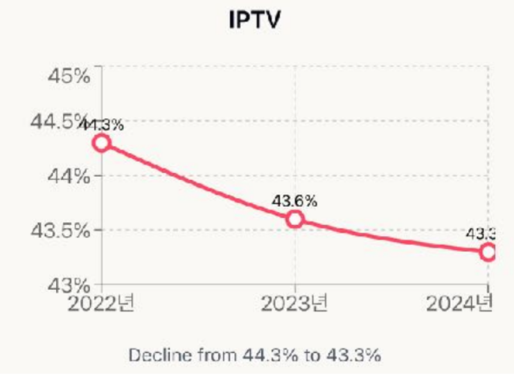 KT의 유무선 통신과 IPTV 사업 경쟁력이 현저히 약화된 것으로 나타났다. 과학기술정보통신부 통계에 따르면 2024년 KT 이동통신 가입자는 2022년 대비 약 38만 회선 감소했다. 이는 통신 3사 중 가장 큰 감소폭으로 KT의 지속적인 시장 점유율 하락을 보여준다.