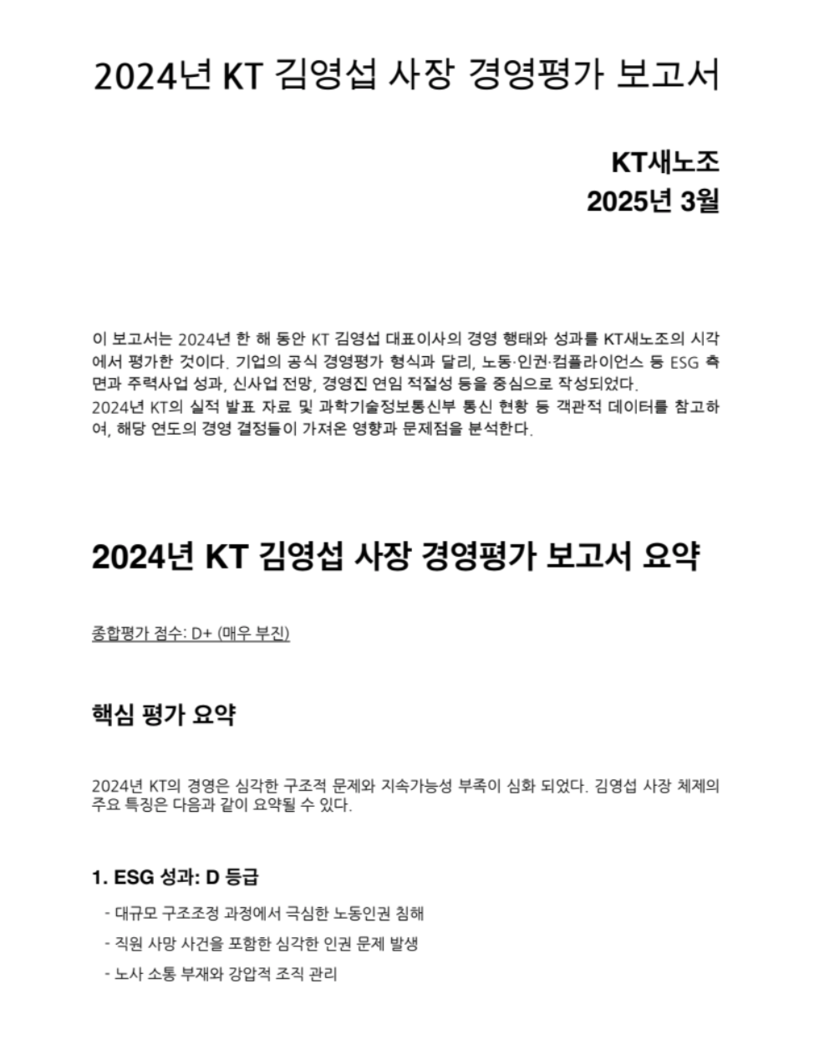 보고서는 끝으로 "KT의 2024년 경영 방식은 단기 실적 중심의 구조조정과 부동산 매각에 집중됐으며 노동 인권 문제와 불통 경영으로 인해 ESG 평가에서도 최하위 등급을 받았다"며 "이러한 경영 기조가 지속될 경우 KT의 장기적인 경쟁력 저하는 불가피할 것으로 보인다"고 밝혔다.