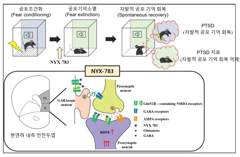 연구진은 외상후 스트레스 장애 동물 모델에 공포 상황 24시간 후 NYX-783을 주입했으며 공포기억 재발이 억제됨을 확인했다. 분석 결과, 변연하 내측 전전두엽 내 흥분성 신경세포의 GluN2B 소단위체 단백질을 포함한 NMDA수용체가 활성화됐다.