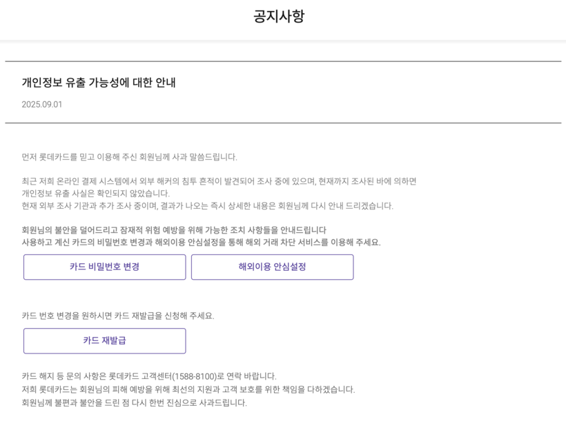 한편, 롯데카드는 지난 1일 홈페이지 상에 공지를 통해 해킹 사고에 대해 사과문을 게재했다.