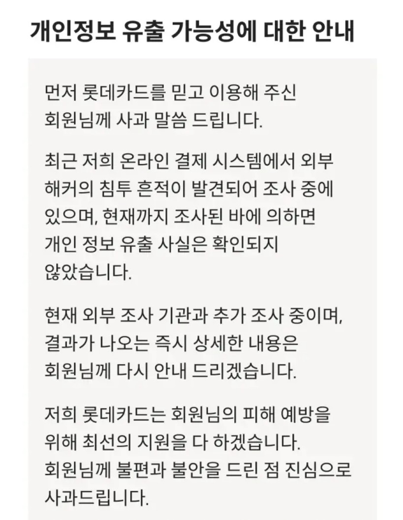 롯데카드는 “롯데카드를 믿고 이용해 주신 회원님께 사과 말씀 드립니다. 최근 저희 온라인 결제 시스템에서 외부 해커의 침투 흔적이 발견되어 조사 중에 있으며, 현재까지 조사된 바에 의하면 개인정보 유출 사실은 확인되지 않았습니다”고 밝혔다.