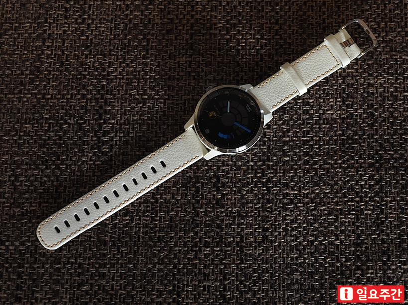 기본으로 제공되는 스트랩은 화이트 실리콘 스포츠 밴드와 화이트에 레드 스티치가 일품인 레더 밴드 2가지가 제공된다.