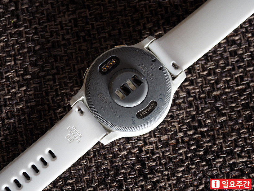 시계 밴드는 22mm 방식으로 기본 제공밴드는 퀵 릴리즈 기능을 통해 별도의 도구 없이도 바로 시계줄 교체가 가능하다. 스포츠 용도로 스마트워치를 구매하는 사용자들은 실리콘으로 된 밴드를 많이 선호하지만, 정장이나 기타 캐주얼에는 레드 스티치의 레더밴드를 추가로 제공해 쉽게 교체할 수 있게 배려했다.