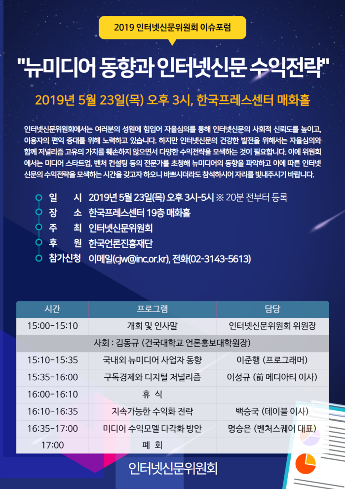 이슈포럼 참가신청은 인터넷신문위원회 사무처로 하면 된다.