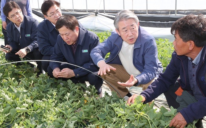| ▲강호동 농협중앙회장은 지난 13일과 15일 참외농가 등을 방문해 일조량 부족에 따른 생육부진피해현장을 점검하고 농업인을 위로했다.(사진=농협중앙회 제공) |