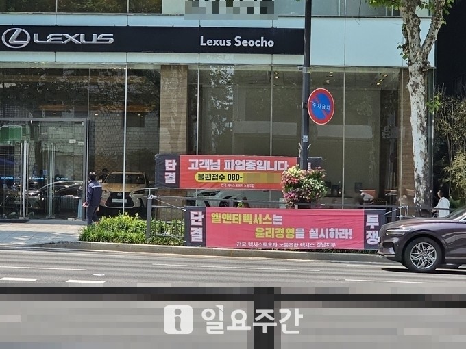 ▲서울 서초구 렉서스 서초매장 앞에서 집회 중인 전국 렉서스 노동조합. (사진=일요주간DB) |