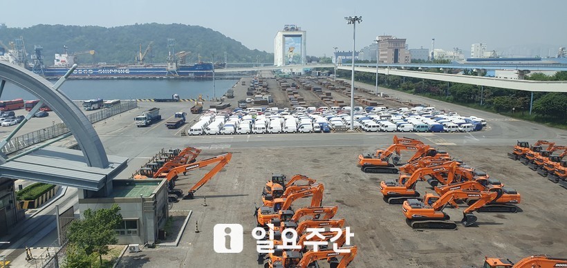 | ▲ ‘월미바다열차’에서 포착된 인천 부두의 모습. 수출길에 오른 ‘중고 차‧중장비’가 즐비하다. |