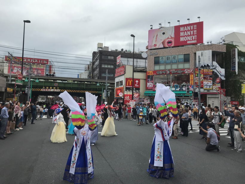▲ 신오쿠보 축제에서 한인 단체의 참가 모습(오쿠보역 부근) |
