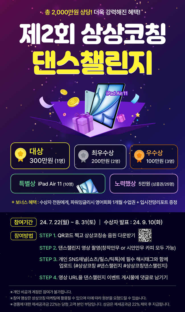 초중고 1대1 코칭교육 전문브랜드인 상상코칭에 따르면 제2회 상상코칭 댄스챌린지는 제1회 댄스챌린지 상금보다 5배 높인 총 2000만 원으로 상금뿐 아니라 특별상으로 아이패드 10대를 포함해 청소년들의 창의적인 참여를 유도할 계획이다.