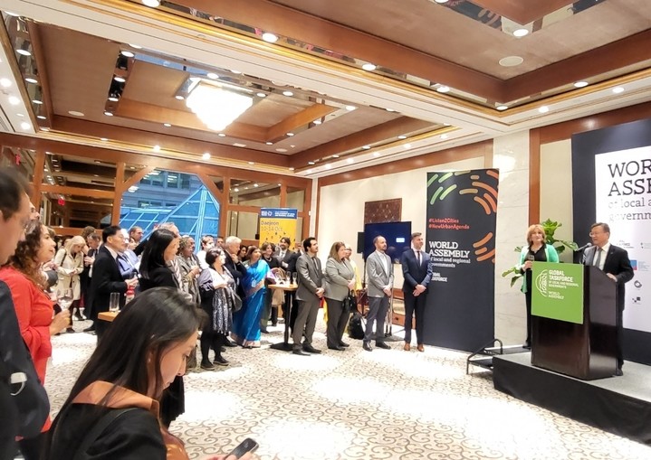 | ▲ 2022년 4월 27일 당시 김명수 대전시 과학부시장이 UN본부(뉴욕)에서 지방정부 세계총회를 적극 홍보하고 있다. 사진제공(대전광역시) |