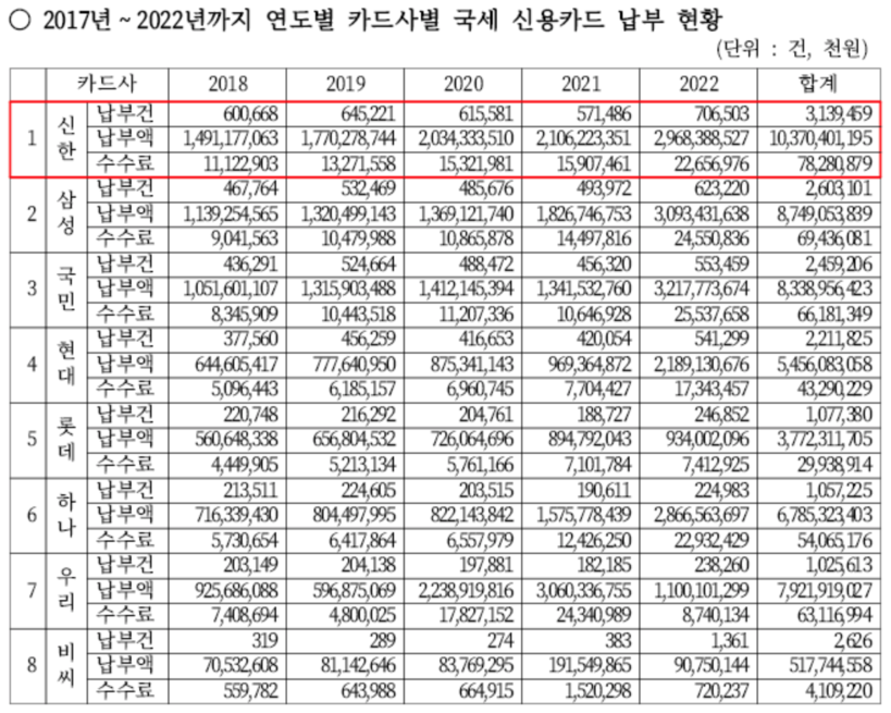 5년(2018~2022) 간 카드사별 국세 신용카드 납부 실적을 살펴보면 신한카드가 313만 9459건(10조 3704억 119만 5000원)으로 가장 많았으며 다음으로 삼성카드 260만 3101건(8조 7490억 5383만 9000원), 국민카드 245만 9206건(8 조 3389억 5642만 3000원) 등의 순이다. 해당 기간 실적 건수가 가장 많았던 신한카드의 경우 납세자를 상대로 받은 납부 대행 수수료만 782억 원이었으며 8개 카드사 전체로는 4821억 원에 달했다.