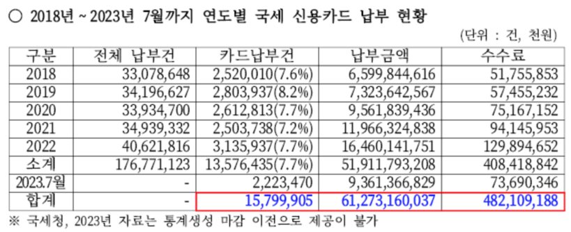 카드사가 벌어들이는 국세 카드 납부 수수료는 2018년 517억 5585만 3000원, 2019년 574억 5523만 2000원, 2020년 751억 6715만 2000원, 2021년 941억 4595만 3000원, 2022년 1298억 9465만 2000원으로 매년 큰 폭으로 증가하고 있다.(2023년 7월까지 카드사 수취 수수료 736억 9034만 6000원)