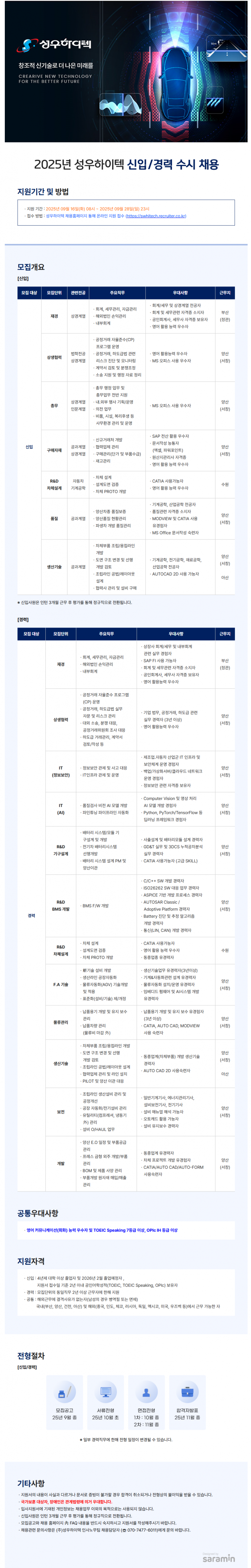 모집 직무는 회계, 세무, 법무, IT, 제품 설계, 생산기술, 품질관리, 보전, 물류, 구매 등 폭넓게 구성됐다. 근무지는 부산 본사(기장군 정관읍)를 비롯해 경남 양산, 충남 아산, 경기 수원 등이며, 직무별 자세한 요건과 우대사항은 성우하이텍 채용 홈페이지에서 확인할 수 있다.