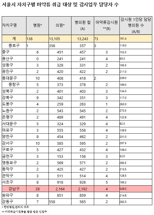특히 성형외과 등이 몰려있어 관리 대상 병·의원이 2192개에 이르는 강남구의 경우 관할 마약류 의약품 취급 병·의원을 관리·감독하는 인원은 4명 뿐인 것으로 조사됐다. 이들 중 전담 인력은 1명이고 나머지 3명은 겸임 인력이었다. 겸임을 포함해 한 사람당 548개 의료기관을 도맡고 있는 것이다. 도봉구도 관리·감독 인원이 1명 혼자 관할구역 내 263개 병·의원을 모두 맡고 있는 것으로 나타났다.
