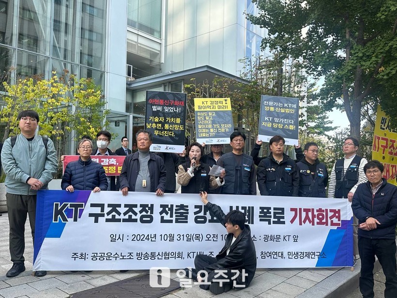 [일요주간=임태경 기자] KT(대표 김영섭)의 구조조정을 둘러싸고 노사 간 대립이 격화하고 있는 가운데 지난달 31일 방송통신협의회, KT새노조, KT민주동지회, 참여연대, 민생경제연구소는 광화문 KT 본사 앞에서 'KT 구조조정 전출 강요 사례 폭로' 기자회견을 열었다.