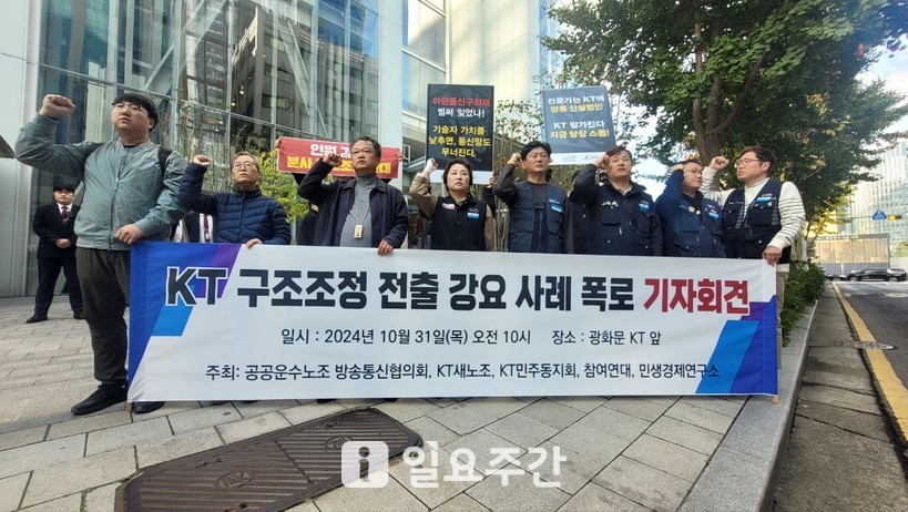 이날 이들 단체는 "KT 김영섭 사장과 안창용 부사장을 비롯한 경영진이 구조조정 과정에서 직원들에게 전출을 강요하고 있는 부당 행태를 폭로하기 위해 이 자리에 섰다"며 "이러한 경영진의 강압적이고 비윤리적인 행태를 강력히 규탄한다"고 목소리를 높였다.