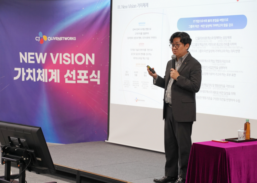 ▲ CJ올리브네트웍스가 ‘디지털 기술과 데이터를 기반으로 공간과 일상의 변화를 선도하는 라이프스타일 혁신 기업’이라는 뉴 비전(New Vision)을 선포하며 새로운 도약에 나선다. CJ올리브네트웍스는 지난 10일 용산 트윈시티 본사에서 전 임직원 대상으로 CEO 타운홀 미팅을 겸한 온·오프라인 비전 선포식을 개최했다. (사진=CJ그룹 제공) |