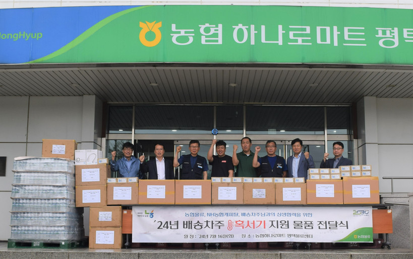 [일요주간 = 노현주 기자] 여름철 폭염 속에서도 농축산물과 영농물자의 신속하고 안전한 배송을 위해 묵묵히 업무를 수행하는 배송차주들을 위해 농협물류(대표이사 최선식)가 16일 평택물류센터에서 NH농협캐피탈과 함께 여름철 폭염 극복을 위한 ‘배송차주 혹서기 지원물품 전달식’을 가졌다.