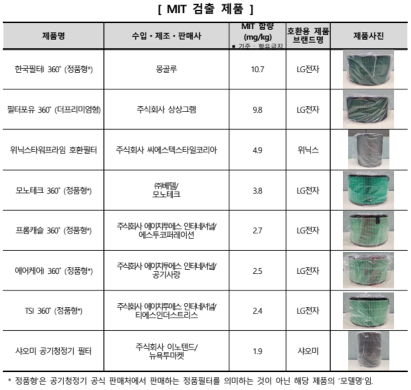 MIT 검출 제품 함량을 보면 한국필터(제품명, 수입·제조·판매사 몽골루) 호환용 제품에서 가장 많은 10.7mg/kg이 검출됐다. 이어 필터포유(제품명, 수입·제조·판매사 주식회사 상상그램) 호환용 제품에서 9.8mg/kg 등의 순으로 나타났다.