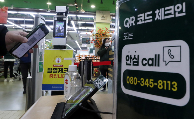 | ▲ 대형마트나 백화점 등 대규모 점포에 대한 방역패스(접종증명·음성확인제) 실시 의무화를 하루 앞둔 9일 오후 서울 시내 한 대형마트에서 시민들이 QR코드로 출입인증을 하고 있다. (사진=뉴시스) |