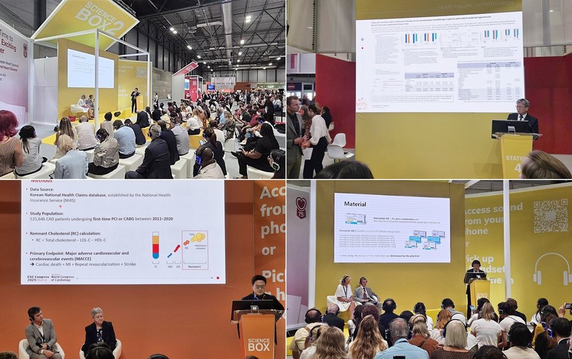 ▲ 스페인 마드리드에서 열린 유럽심장학회 연례학술대회(ESC Congress 2025)에 참석한 교수진들이 한미약품의 대표 심혈관질환 치료제의 임상적 이점에 대한 발표를 진행하고 있다. (시계방향으로, 행사장 전경, 동국대학교 의과대학 심장내과 이무용 교수, 양산부산대병원 순환기내과 천민구 교수, 원주세브란스기독병원 심장내과 이중희 교수). (사진=한미약품 제공)