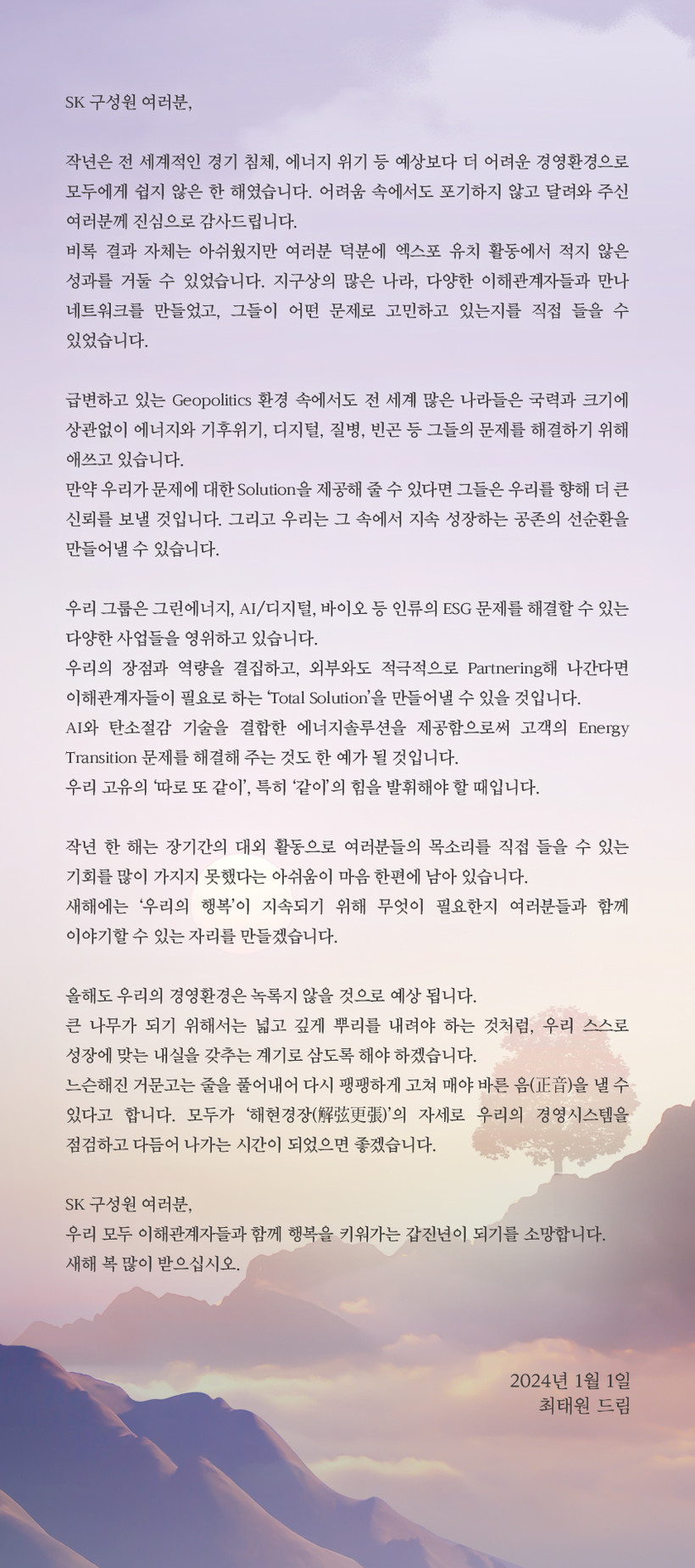 최 회장은 마지막으로 “큰 나무가 되기 위해서는 넓고 깊게 뿌리를 내려야 하는 것처럼 올해 녹록지 않을 것으로 예상되는 경영 환경을 우리 스스로 성장에 맞는 내실을 갖추는 계기로 삼도록 해 달라”고 주문하고, “SK 구성원들이 모두 이해 관계자들과 함께 행복을 키워가는 갑진년(甲辰年)이 되기를 소망한다”고 신년사를 마무리했다.