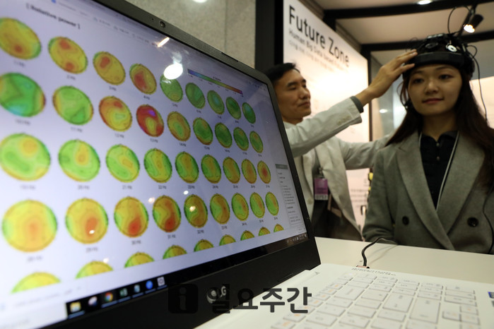▲'휴먼 빅데이터 사업 전시회'에서 관계자가 뇌파 측정 시스템을 체험하고 있는 모습. |