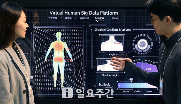 ▲'휴먼 빅데이터 사업 전시회'에서 관계자들이 근골격계 진단 장치로 분석한 운동 빅데이터를 살펴보고 있는 모습. |