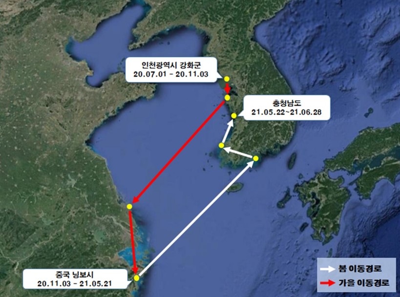 국립생태원에 따르면 이번에 돌아온 저어새(Y21)는 지난해 11월3일 우리나라를 출발해 11월 4일 중국 저장성 닝보시 리양 만에 도착했다.