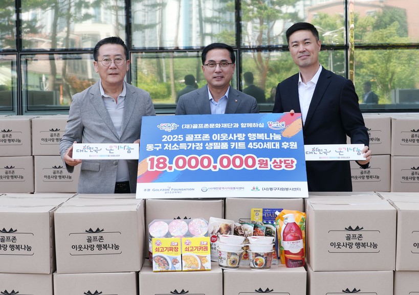골프존문화재단(이사장 김영찬)은 지난 9일 대전광역시 동구청에서 ‘2025 골프존 이웃사랑 행복나눔’ 후원식을 열고, 취약계층 450세대에 총 1800만 원 상당의 식료품과 생필품 키트를 지원했다고 10일 밝혔다.
